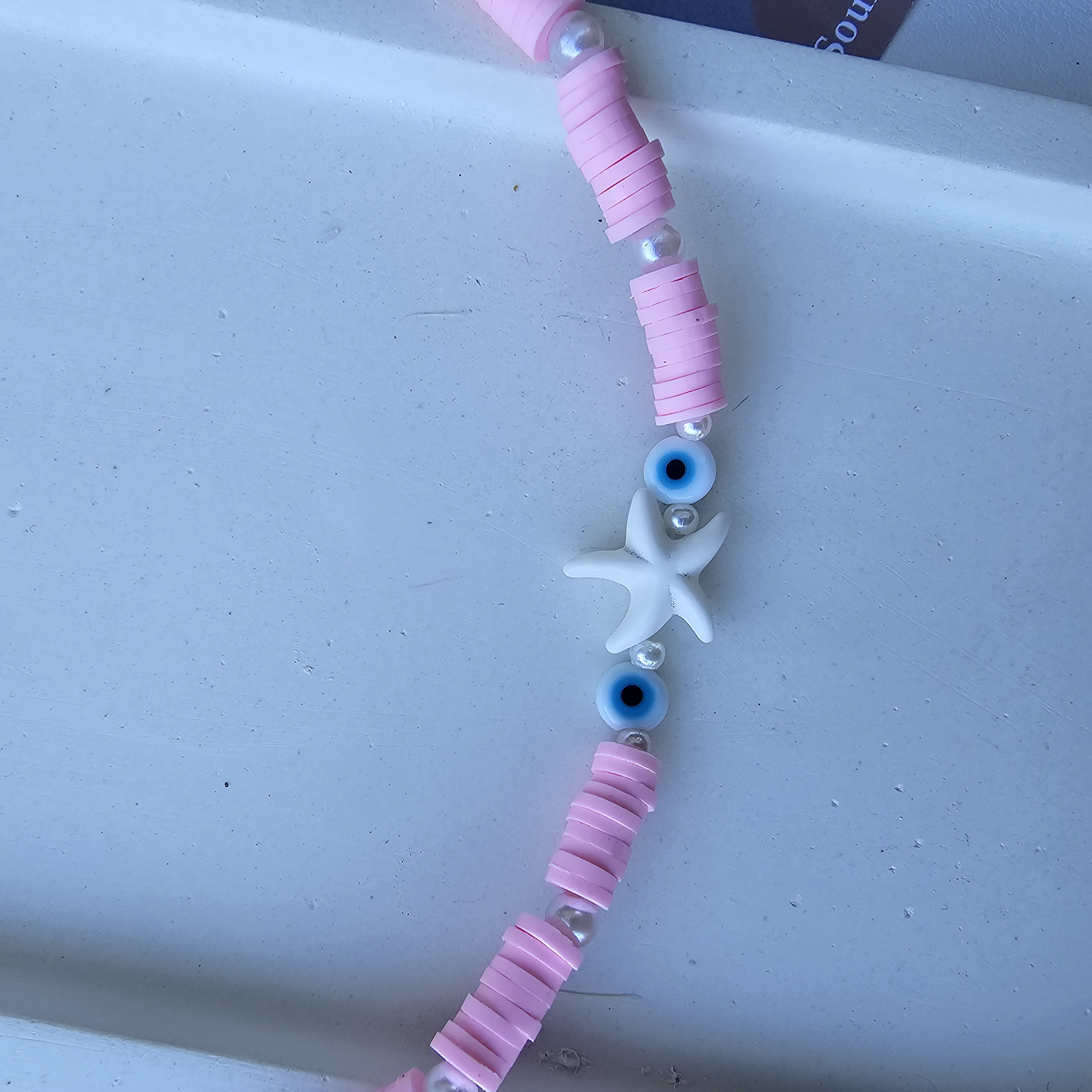 گردنبند فیمو صورتی با مهره ستاره دریای و مهره چشم نظر